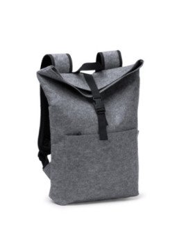 Mochila con solapa elaborada en fieltro reciclado. Cuenta con mosquetón para cierre del compartimento principal, bolsillo frontal para guardar pequeñas pertenencias y asas ajustables.