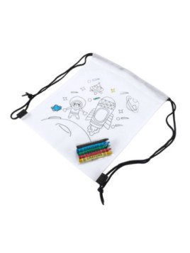 Mochila infantil de cuerdas realizada en non-woven, con diseño para colorear. Incluye 5 ceras en colores variados.