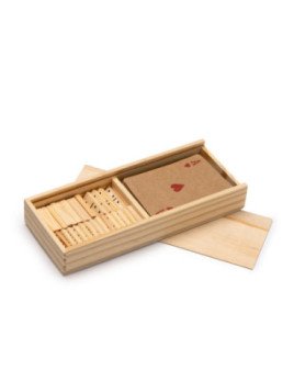 El set de 2 juegos que incluye una baraja de cartón reciclado y un dominó de madera, presentados en una elegante caja de madera. Ideal para disfrutar de juegos clásicos de manera sostenible y con estilo, perfecto para regalar o para uso personal.