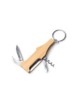 Llavero multiherramienta elaborado en acero con cuerpo en bambú. Cuenta con 4 funciones: sacacorchos, abrelatas y navaja y abridor.