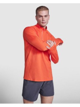 Sudadera técnica perchada manga ranglan y media cremallera invertida con detalle reflectante. Cubrecosturas en cuello interno. Puños con ojal para pulgar. Detalles reflectantes en la espalda. Faldón trasero. Certificado GRS.