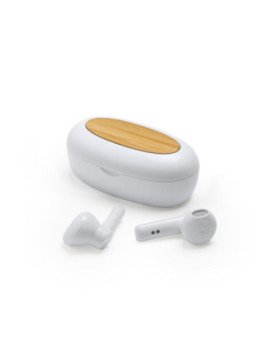 Auriculares inalámbricos presentado en estuche elaborado en material reciclado y detalles en bambú en la superficie. Con control de reproducción de audio, con funciones de control de volumen, pista siguiente. También cuenta con función de manos libres y asistente de voz mediante botón multifunción táctil de ambos auriculares. Incluye indicador luminoso en ambos auriculares e indicador luminoso en el estuche de carga.