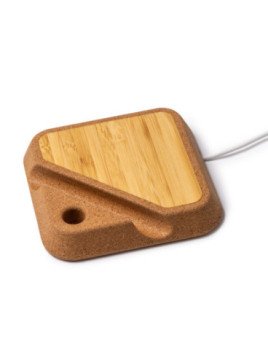 El cargador inalámbrico con cuerpo elaborado en corcho y superficie de carga inalámbrica en bambú. Con potencia de 10W y soporte para smartphone y para bolígrafo. Compatible con dispositivos provistos de tecnología de carga inalámbrica.