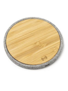 Cargador inalámbrico con cuerpo elaborado en tejido RPET y superficie de carga en bambú. Compatible con dispositivos provistos de tecnología de carga inalámbrica.
