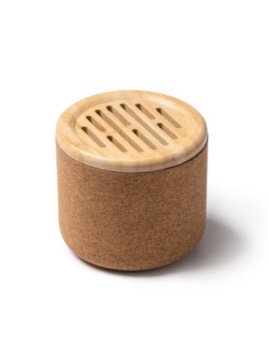 Altavoz inalámbrico elaborado con cuerpo de corcho y superficie de bambú. Con potencia de 3W y batería recargable. Cuenta con botón multifunción, indicador luminoso de carga y salida de audio con conexión Bluetooth. Con puerto Tipo C para carga, cable incluido.
