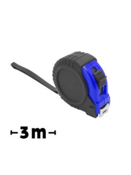 Fléxometro de 3 metros homologado, con mecanismo de bloqueo y cuchilla metálica. Cuerpo en color con funda de goma, clip metálico y cinta de transporte.
