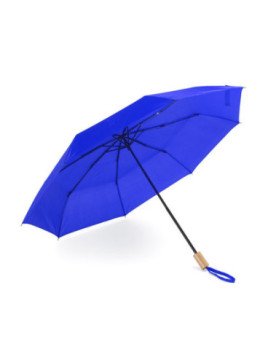 Paraguas plegable de RPET con funda a juego. Bastón, varillas y terminaciones en negro. Mango de madera natural. Cierre con velcro a juego y apertura manual. Diámetro 95 cm.