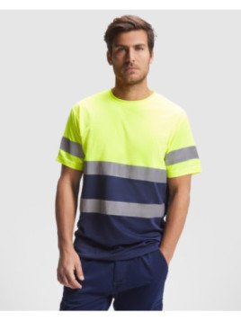 Camiseta manga corta alta visibilidad ·Tejido técnico transpirable. ·Dos bandas reflectantes en el cuerpo y una en las mangas. ·Cuello en el mismo tejido. ·Cubrecosturas en el cuello. ·Opciones de color en liso y combinado. ·Etiquetado Roly WRK exterior. ·Ciclos de lavado: x25