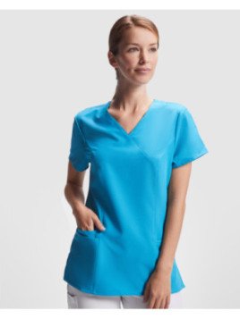 Casaca sanitaria de manga corta con cintura ligeramente ajustada. · Microfibra. · Cuello de pico con escote cruzado. · Costadillos delanteros y traseros. · Dos bolsillos laterales y uno interno en el bolsillo derecho. · Aberturas laterales en bajo. · Etiquetado Roly WRK exterior.
