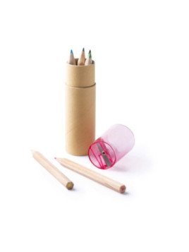 Set de 6 lápices de madera en estuche de cartón reciclado y capucha translúcida de color. Incluye sacapuntas integrado en la capucha. Disponible en varios colores.