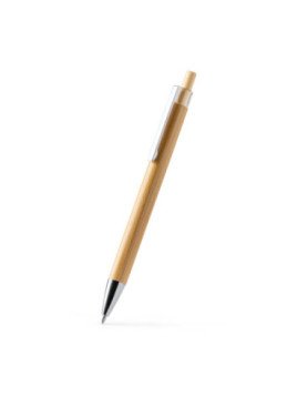 Bolígrafo con cuerpo y pulsador de bambú, clip metálico y detalles cromados. Tinta azul.