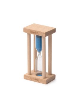 Reloj de arena con duración de 3 minutos insertado en una estructura de madera, que le confiere elegancia a la vez que resistencia.