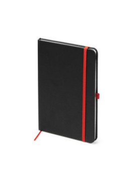 Bloc de notas A5 con tapa rígida de PU negro. Marcapáginas, banda elástica de cierre y soporte para bolígrafo a color. Cuenta con 80 hojas rayadas.
